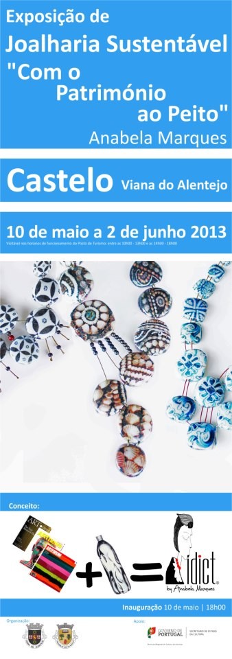 Até ao próximo dia 2 de junho está patente ao público, no Castelo de Viana do Alentejo, uma exposição de joalharia sustentável “Com o Património ao Peito”, de Anabela Marques. Ao todo são 16 conjuntos de peças – colares, pregadeiras, brincos e pulseiras – com imagens alusivas a monumentos do concelho.