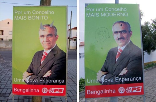 Como não foram ainda colocados cartazes pela candidatura do Partido Socialista, não temos a lamentar esse tipo de atos em material de campanha. Contudo, deixo aqui 2 exemplos do que foi feito há 4 anos na última campanha eleitoral a cartazes do PS e que nunca atribuímos a pessoas afetas a outras candidaturas (deixo ainda o link para o blogue que utilizei em 2009, e que continua acessível: http://unidos-com-bengalinha.blogspot.pt/2009/10/calma-e-serenidade.html ).