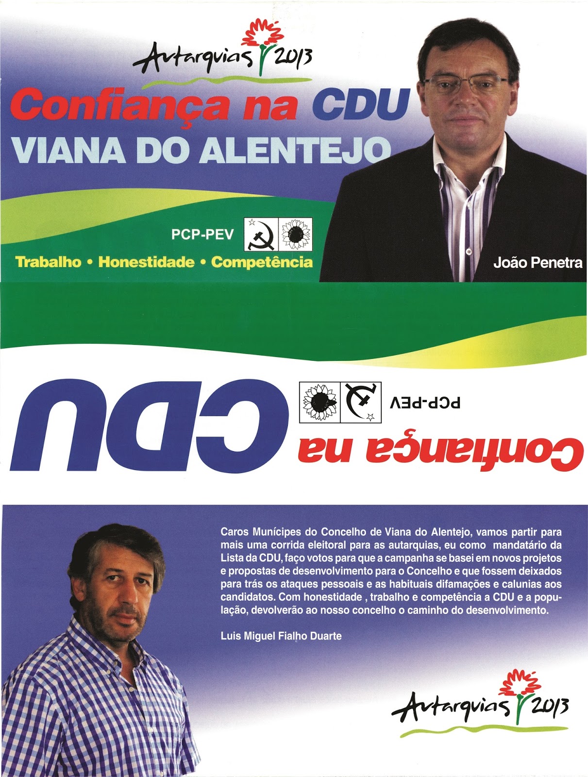 Nos passados dias 13 e 14 de Julho, do corrente ano, o Sr. João Penetra, cabeça de lista pela CDU/Viana às eleições autárquicas 2013, realizou nas três freguesias do concelho de Viana do Alentejo, uma acção de porta a porta onde foi distribuído um folheto de propaganda eleitoral, tendo sido o mesmo publicitado em 15 de Julho sua página de facebook .